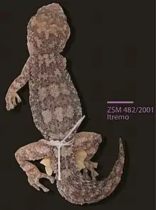 The Ibity ground gecko was first described in 1998 by Rösler & Krüger under the scientific name Paroedura bastardi ibityensis, with the authors believing it to be a subspecies of the Mocquard's Madagascar ground gecko (Paroedura bastardi).[2] However, later studies would find that it differs both morphologically and genetically from the nominate form of Paroedura bastardi, and it has been recognized as a separate species since 2008, now known as Paroedura ibityensis. The specific name refers to Mount Ibity, the type locality.[3]