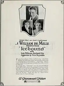 Icebound is a 1924 American silent drama film directed by William C. deMille, produced and distributed by Paramount Pictures, and based on a 1923 Pulitzer Prize Broadway produced play of the same name by Owen Davis.[1] This film production was made at Paramount's Astoria Studios in New York City.[2][3] Actress Edna May Oliver returned to the role that she played in the Broadway version.