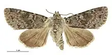 ♀. 43 mm. Head whitish mixed with grey and blackish. Thorax grey mixed with whitish. Abdomen ochreous-grey-whitish. Forewings rather elongate-triangular, apex obtuse, termen slightly waved, obliquely rounded ; fuscous-grey, mostly overlaid with white suffusion ; subbasal line cloudy, dark fuscous, not reaching dorsum ; first and second lines indistinctly margined with dark-fuscous irroration, first slightly curved, second waved, strongly curved outwards on upper 2⁄3 ; median shade of dark-fuscous irroration, bent near costa ; orbicular-suboval, whitish, edged laterally with dark fuscous ; reniform whitish, lower third fuscous-grey edged with whitish : anterior edge of subterminail line formed by a waved shade of dark-fuscous irroration. Hindwings fuscous.[3]