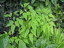 Leaves are divided in threes twice or three times and toothed.