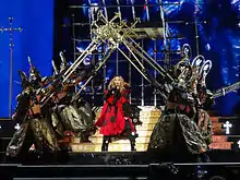 "Iconic" was chosen to be the opening song from the Rebel Heart Tour (2015–16). It begins with a video featuring Madonna in a glamorous dress cavorting with bare-bodied males juxtaposed with Mike Tyson talking inside of a cage.[44] Tyson commented about the shooting, saying: "Riveting is not [the word]. It's just intense... I'm in a cage. I'm a hostage. I'm chained. I'm naked. I look like a savage. When I [shot] it, it didn't seem that intense. But then you watch it and go, 'Whoa'. It was like [something out of] National Geographic. I need to be tamed, man."[45] Madonna performed wearing an "ornate kimono-like robe with wide sequin-lined sleeves"[46] inside a medieval-looking cage surrounded by religious iconography that she later breaks out of as she sings the first lines,[47][48] while guards dressed similar to the ones who guarded the Wicked Witch of the West's castle marched onstage.[49] During the performance, she also hung upside down on a cross.[50]