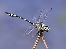 Ictinogomphus australis, known as the Australian tiger, is a species of dragonfly in the family Lindeniidae,[3] which was formerly part of the family Gomphidae. It is found near rivers, lagoons, lakes and ponds. They are large dragonflies (wingspan 100mm, length 70mm) with eyes widely spaced on top of the head. They have clear wings and are yellow and black in colour. The males are identified from females by two curved flaps below segment eight of the abdomen. They are found in an arc ranging from about Broome, Western Australia along the north of the continent to Point Hicks on the south-east corner.[4] The taxon has been assessed for the IUCN Red List as being of least concern.
