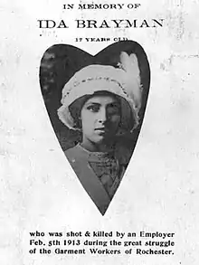 Ida Braiman and her father were participants in a citywide strike of the United Garment Workers of America only months after her arrival in the United States. On February 5, 1913, she was part of a group of strikers going to small textile factories encouraging workers their to join the strike.[3] The strikers, a crowd of some seven hundred people, picketed a tailor shop owned by Valentine Sauter. When picketers began to throw stones, Valentine Sauter used a shotgun to fire into the crowd, killing Braiman and injuring three others.[4] Although Sauter was arrested and charged with first-degree murder, a grand jury declined to indict him.[2] Several strikers from the crowd were also arrested for rioting.[4]