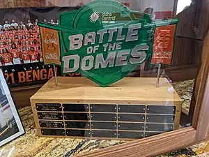 With the introduction of the Battle of the Domes branding in 2018, a traveling trophy was also introduced. The Battle of the Domes trophy is prominently green (representing Idaho Central Credit Union's colors), and is mounted on a wooden base. There are 20 small plaques located on the base of the trophy, which are filled in after every football game between the two, detailing the winner, date, and score. The winner of the overall Battle of the Domes competition is awarded temporary possession of the trophy. Idaho and Idaho State have won the trophy twice since the rivalry renewed on an annual basis; Idaho in 2019 and 2021, Idaho State in 2018 and 2020.