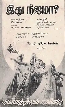 Idhu Nijama (transl.Is This True?) is a 1948 Tamil-language thriller film directed by Krishna Gopal and produced by S. Soundararajan Ayyengar. The film dialogue was written by V. Seetharaman. The film script was written by S. Balachander as well as the music, an asset to the film. The film starred S. Balachander (as twins), Sarojini and Kumari N. Rajam, playing lead, with V. Seetharaman, Manuel, Pattammal and A. S. Nagarajan playing supporting roles.[1][2] This film was inspired by the American Classic film Wonder Man (1945). Decades later, Kamal Haasan's Kalyanaraman was heavily inspired by Wonder Man and Idhu Nijama. The film was run successfully in many centres.[3][4][5]
