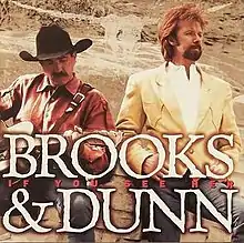 If You See Her is the fifth studio album by American country music duo Brooks & Dunn, released in 1998 on Arista Nashville. The album featured five chart singles: "If You See Him/If You See Her", "How Long Gone", and "Husbands and Wives" (a cover of a Roger Miller song), all of which reached #1, plus "I Can't Get Over You" (which made #5) and "South of Santa Fe" (which stalled at #41). This last song was the first (and only) single of Brooks & Dunn's career to miss Top 40 entirely, and was the last single to feature Kix Brooks on lead vocals instead of Ronnie Dunn. The album is a counterpart to Reba McEntire's album If You See Him (released on the same day), which shared the track "If You See Him/If You See Her". A bonus limited edition EP was made available when consumers bought both If You See Him and If You See Her at the same time.[2] "Born and Raised in Black in White" is a cover of The Highwaymen (aka Waylon Jennings, Willie Nelson, Johnny Cash & Kris Kristofferson) song off their 1990 album, Highwayman 2.