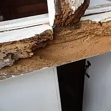 The meeting house has ashlar walls made of local sandstone. The roof slates are also made of a local material—Horsham stone.[1][2] The frontage has two bays with half-hipped gable roofs. The entrance doorway is centrally placed between the bays and still has its original rustication at the quoins,[1][2] although the door itself is modern. The lintel of the doorway has "1676" carved into it, and some of the quoin blocks also have 17th-century dates and initials. There is another (off-centre) doorway on the rear face of the building. This has one window at ground-floor level, whereas the frontage has one in each bay with wooden mullions and transoms. There are smaller windows at first-floor level.[2]