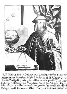 Father Ferdinand Augustin Hallerstein, his co-operator and successor, considers him "one of the most cultivated minds that ever came into these countries".[4] Kögler carried on a brisk scientific correspondence with a number of European scholars, such as Eusebius Amort and T. S. Bayer, the Orientalist, sending Bayer many contributions for his "Museum Sinicum".[5]