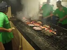 As an archipelagic nation, ikan bakar is very popular in Indonesia, commonly found in many places; from an Acehnese beach, to a restaurant perched over Kupang's harbour in East Nusa Tenggara, to the center of Jakarta's business district.[2] Various specific versions exist, including as Sundanese ikan bakar Cianjur,[4] which is usually grilled freshwater fish, such as carp and gourami, and Balinese ikan bakar Jimbaran, freshly grilled seafood fish in warung clustered near Jimbaran beach and fish market in Bali.[5] Barbecued seafood however, is especially popular in Sulawesi and Maluku where most of the people work as fishermen, and both areas have a vast seas which bring them different kind of seafood.[6] Usually, the fish is marinated with mixture of spices pastes, and sometimes with belacan or kecap manis (sweet soy sauce) and then grilled; sometimes protected with a sheet of banana leaf placed between the seafood and grill to avoid the fish being stuck to the grill and broken to pieces.[6]