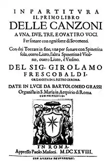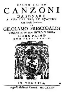 Il Primo Libro delle Canzoni is a collection of instrumental Baroque canzonas by the Ferrarese organist and composer Girolamo Frescobaldi. It was published in two different editions in Rome in 1628, and re-issued with substantial revisions in Venice in 1634.[1] The three editions of the Primo Libro contain a total of forty-eight canzonas for one, two, three or four instrumental voices in various combinations, all with basso continuo; as a result of revisions, sixteen of the canzonas exist in two substantially different versions.