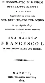 Il borgomastro di Saardam (The mayor of Saardam) is an 1827 melodramma giocoso (opera buffa) in two acts by Gaetano Donizetti. The libretto, by Domenico Gilardoni, was based on the 1818 play Le bourgmestre de Sardam, ou Les deux Pierres by Mélesville, Jean-Toussaint Merle and Eugène Cantiran de Boirie. Albert Lortzing's 1837 opera Zar und Zimmermann is ultimately based, via a German translation, on the same French play. The plot concerns a famous episode in the life of Peter the Great, in which he disguised himself under an assumed name as a worker in the shipyards of Saardam, and has certain similarities to Donizetti's earlier 1-act farce Il falegname di Livonia.[1][2]