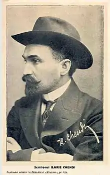 He made his prose-writing debut in 1893, and in 1898 settled in Bucharest, capital of the Romanian Old Kingdom. He published three volumes of critical columns, fragments and impressions over the course of three years (1903, 1904 and 1905), an unprecedented level of activity for a Romanian critic. Further works of impressions and literary biography followed in 1908 and 1911. For a time, he was aligned with the Sămănătorul circle of Nicolae Iorga, but broke with them in 1906. He then founded Viaţa literară, later Viaţa literară şi artistică, a magazine that appeared over the course of the year 1907 and that he wrote almost in its entirety, sometimes under pseudonyms. Although still influenced by his former colleagues' ideas—Zigu Ornea labeled the publication "a dissident sămănătorist magazine"—he pursued a somewhat independent course, engaging in bitterly ironic polemics with Iorga. Chendi was among the founders of the Romanian Writers' Society. His intellectual ascendancy was ongoing when he committed suicide in 1913.[4]