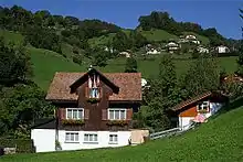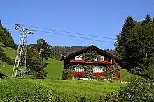 Farm house in Illgau, with a tower of the aerial tramway Illgau - St.Karl