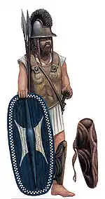 Shields were used among the Illyrians as early as the Bronze Age. In the Iron Age two types of shields were used: the Illyrian circular shield and the oval/rectangular type used by the northern Illyrians. The most common was the circular shield, which was made of wood and leather with a bronze boss and was like a mostly light pelte.[69] The Illyrian circular shield resembled the Macedonian version but differed from the number of circular decortication. Their shapes with either round (peltes), rectangular or oval.[70] A type of wooden oblong shield with an iron boss was introduced to Illyria from the Celts.[71] This type of shield resembled the Illyrian oval shield used in northern Illyria.