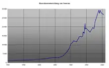 In the past, Ilmenau had been a small town of less than 2,000 inhabitants. Population growth began in the 19th century from 2,000 in 1800, 2,800 in 1850 and reaching 3,400 in 1870. Subsequently, the population grew rapidly to 10,400 in 1900 and 17,300 in 1940. After World War II, the population rose further to 20,000 in 1975 and to the peak in 1988 with a population of 29,500. The unfavourable economic situation in the old East Germany after reunification in 1990 resulted in a decline in the population, which fell to 27,000 in 2000 before stabilising.