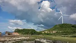 Ilocos Norte is noted for its distinctive geography and culture.[4][5] This includes numerous examples of well-preserved Spanish colonial era architecture, particularly Saint William's Cathedral in Laoag with its sinking bell tower done in the Earthquake Baroque style,[6] the St. Augustine Church in Paoay which is one of UNESCO's World Heritage Sites in the Philippines[7] and the Cape Bojeador Lighthouse. Famous geographical features include the La Paz Sand Dunes, the beaches of Pagudpud, and the eroded calcarenite Kapurpurawan rock formation in Burgos.[8] It is the birthplace of several notable Philippine leaders including former President Ferdinand E. Marcos,[9] Philippine Revolutionary War general Artemio Ricarte and Iglesia Filipina Independiente co-founder Gregorio Aglipay.[10] Three wind farms are located in Ilocos Norte. They are located in Burgos, Pagudpud and Bangui with the latter being the first wind power generation plant in the Philippines.[11]