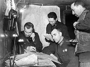 Konstantin Simonov (in center) and Ilya Vlasenko (right) at the command post of the 75th Guards Rifle Division near Ponyri. Battle of Kursk. 1943