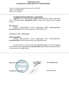 - ↑ "Certificate of appointment for Ilya Zaslavskiy as chairman of the managing board (Совет директоров) of Mosmetrostroy" (in Russian). October 31, 2002.
