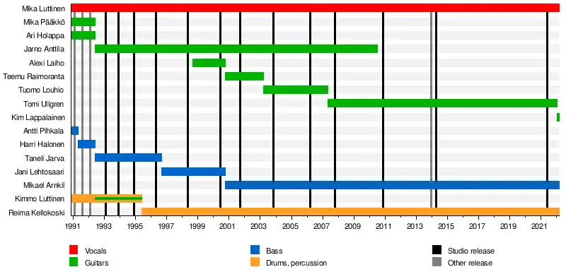 | Past members | Kimmo "Sir" Luttinen Tomi "UG" Ullgren Ari Holappa Mika Pääkkö Harri Halonen Jarno Anttila Taneli Jarva Marko Hietala Jani Lehtosaari Alexi Laiho Teemu Raimoranta Tuomo "Tuomio" Louhio |