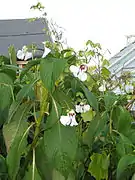 This erect perennial grows from large underground tubers, to a height of 2 m (6.6 ft) or more. It has deeply-veined, elliptic, slightly toothed leaves. Large 6 cm (2.4 in) hooded white flowers, with deep crimson splashes in the centres, hang from short stems in summer and autumn. Each flower bears a curved red spur at the back, up to 5 in (13 cm) long. The flowers are scented like gardenias.[2] The stems and leaves are succulent and fleshy.[2][3]