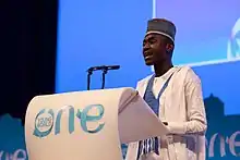 His efforts in initiating peaceful youths in Northern-Nigeria made him speaker, particularly regarding to political instability in the country.[1] He was a speaker/panelist at the 2016/2017 International Day of Peace events at the United States Institute of Peace (USIP),[18] speaker at the 2017 Wage Peace event at the American University, speaker/panelist at the 2017 United Nations International Youth Day event,[19] speaker at the 2018 United Nations International Day for the Remembrance of Victims of Terrorism and the 2018 One Young World Summit.[20]