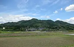 Imuta-ike is surrounded by mountains; Funamidake (498.8 metres (1,636 ft)), San-o-dake (491 metres (1,611 ft)), Katagi-yama (508.8 metres (1,669 ft)), Tōmigashiro (477 metres (1,565 ft)), Ī-moriyama (432 metres (1,417 ft), known due to its beauty also as Imuta-fuji), and there is no incoming large river. The outgoing water flows into Sendai River and Hiwagi River. Imuta-ike is in the last stage of the lake-pond formation cycle and is shrinking with the deposition of sediment. The colour of the pond is brown, 14 on the Forel-Ule scale, and its pH is 6.8; the water of the pond contains organic substances.[5] There are many cherry trees around the pond. About one third of its area, to the northwest, is wetland; dotted by floating islands composed of peat. This is very rare in warm areas and the pond was designated a Natural Monument as the "peat forming vegetation of Imuta-ike" in 1921.[4]