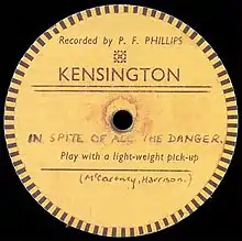 Around July 1958,[nb 1] the Quarrymen paid for a recording session at Percy Phillips' home in Kensington, Liverpool, recording a cover of Buddy Holly's "That'll Be the Day" and "In Spite of All the Danger".[16] Lennon, McCartney and Harrison all played guitar,[nb 3] John "Duff" Lowe the piano and Colin Hanton the drums.[1][9] Recording was achieved with a single microphone suspended from the ceiling,[9] no volume balancing possible.[1] Curtains and carpets were put in the downstairs living room to dampen the noise of traffic from the street outside.[1] At nearly three and a half minutes, the song is much longer than most pop recordings of the time.[nb 4] Lewisohn writes, "anecdotes have Percy Phillips waving his arms at them, hurrying them to a finish, because he could see the disc-cutting lathe reaching its ultimate point, almost at the center label."[18]