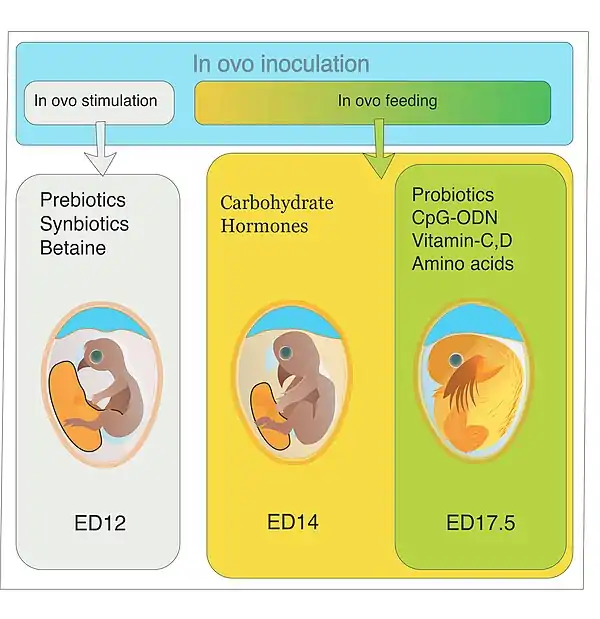 - 1 2 3 4 Das, Razib; Mishra, Pravin; Jha, Rajesh (2021-11-11). "In ovo Feeding as a Tool for Improving Performance and Gut Health of Poultry: A Review". Frontiers in Veterinary Science. 8: 754246. doi:10.3389/fvets.2021.754246. ISSN 2297-1769. PMC 8632539. PMID 34859087.