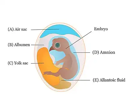 In ovo is Latin for in the egg. In medical usage it refers to the growth of live virus in chicken egg embryos for vaccine development for human use, as well as an effective method for vaccination of poultry against various Avian influenza and coronaviruses. During the incubation period, the virus replicates in the cells that make up the chorioallantoic membrane.[2][3]