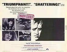 Inadmissible Evidence is a 1968 British drama film directed by Anthony Page and starring Nicol Williamson and Jill Bennett.[1] John Osborne wrote the screenplay, adapting his own 1964 play Inadmissible Evidence.[2] The film portrays the collapse of an angry but sad man who cannot maintain decent standards in his life and antagonises everybody. As with other Osborne plays, it is possible to see his descent as representative of his class, culture and nation.