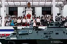 Marcos and his family members watch a military-civilian parade joined by security personnel from the AFP, PCG, and PNP during his presidential inauguration.
