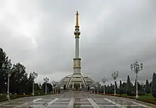 The "Independence Monument" is a monument located in Ashgabat, Turkmenistan.[1] The design of this building was inspired by traditional Turkmen tents and the traditional headgear worn by Turkmen girls. Elements of the building commemorate the independence date of Turkmenistan, 27 September. These elements include a 91-metre (299 ft) reinforced concrete tower with a 27-metre (89 ft) high golden gilt steel construction on top of the tower, along with an observation terrace with a diameter of 10 metres (33 ft). Within the building, there are exhibition halls where important works of art representing Turkmenistan history are displayed. The Monument of Independence sits on a total area of 84,500 m2 (910,000 sq ft), surrounded by green landscaping that encompasses a cascaded pool and 27 heroic statues of Turkmen leaders, centered on a golden statue of Saparmurat Niyazov.[1]