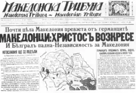 The predecessor of the concept of Independent Macedonia appeared initially in the late 19th century as variant called autonomous Macedonia in the documents of the Internal Macedonian-Adrianople Revolutionary Organization. The organization was founded in 1893 in Ottoman Thessaloniki by a small band of anti-Ottoman Macedono-Bulgarian revolutionaries.[1] The idea then was strictly political and did not imply a secession from Bulgarian ethnicity, but unity of all nationalities in the area, then under Ottoman control.[2] During the Balkan Wars and the First World War the organization supported the Bulgarian army and joined to Bulgarian war-time authorities when they temporarily took control over mosts of Thrace and Macedonia. In this period autonomism as a political tactic was abandoned and annexationist positions were supported, aiming eventual incorporation of occupied areas into Bulgaria. However Bulgaria lost the Wars.