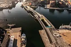 Inderhavnsbroen (lit.: The Inner Harbour Bridge) is a bridge across the Copenhagen inner harbour and is a 180 metres (590 ft) combined pedestrian and bicyclist bridge directed east-west. The bridge is joined to Nyhavn (west) and Christianshavn (east).