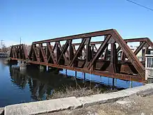 In 1882, an iron swing section replaced the manually operated one. This provided a channel of about 38 feet (12 m). However, a curve in the channel made passage through it difficult.[4] The remaining covered part of the bridge was replaced with a steel swing span in 1902 by Boston Bridge Works giving it a channel of approximately 80 feet (24 m) and aligning the draw with that of the 1885 Washington Bridge[note 2] to the north.[5] Finally, the iron swing section was replaced with fixed pony trusses in 1903. Both of these sections were built around the existing spans, so that rail and water traffic would not be interrupted. During peak working hours, trains could cross the bridge at an average rate of one every four minutes.[6]