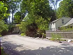 The land in the district is heavily wooded, with tall trees shading the buildings within, mostly frame houses and supporting structures no higher than two stories. Indian Brook, the tributary of the Hudson River that lends its name to the district, closely parallels the road and is even partially included as a contributing property, due to an early mill pond's location along it. The entire area is amid the lesser hills of the Hudson Highlands.[1]