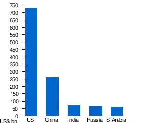 | Top five countries by military expenditure in 2016. According to the Stockholm International Peace Research Institute.[23] |