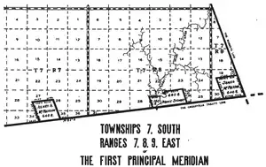Jean Baptiste Richardville was principal chief of the Miami tribe. He was granted tracts of land by the 1818 Treaty of St. Mary's. In Ohio, Article 3 granted "Two sections, on the Twenty-seven mile creek, where the road from St. Mary's to Fort Wayne crosses it, being one section on each side of said creek."[1] This tract was partially in Township 27 North Range 15 East of the Second Principal Meridian in Adams County, Indiana, and part in T3S of R1E of the First Principal Meridian in Van Wert County, Ohio.[2]