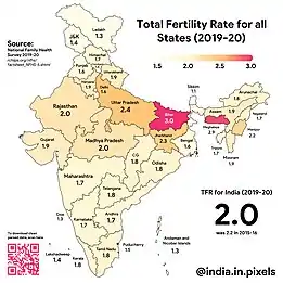 Recent surveys show that in majority of Indian states, fertility rate has fallen well below the replacement level of 2.1 and the country is fast approaching the replacement level itself.[1] The total fertility rate of India in 2017 stood at 2.2.[2] Due to the large population, poverty and strain on resources, the Indian government initiated population control efforts to decrease birth rate with the current target being at 2.1 children per woman.[3] According to data from National Family Health Survey-5, India's total fertility rate dropped below the replacement level of 2.1, and currently stands at 2.0.[4]