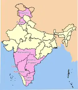Vineyards in India range from the more temperate climate of the northwestern state of Punjab down to the southern state of Tamil Nadu. Some of India's larger wine producing areas are located in Maharashtra, Karnataka near Bangalore and Telangana near Hyderabad. Within the Maharashtra region, vineyards are found on the Deccan Plateau and around Baramati, Nashik, Pune, Sangli and Solapur.[4] The high heat and humidity of the far eastern half of the country limits viticultural activity.[3]