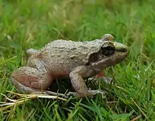 Adult males measure 19–29 mm (0.7–1.1 in) and adult females 24–36 mm (0.9–1.4 in) in snout–vent length.[4] The tympanum is two-thirds of the eye diameter; a strong supra-tympanic fold runs from the eye to the shoulder. The fingers and toes bear enlarged discs; the toes are two-thirds webbed. Dorsal skin is rough with number of folds. Colouration is brownish with many, closely set black spots. The limbs are cross-barred. The venter is white while the throat is finely mottled with brown.[7]