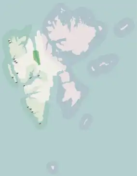 Indre Wijdefjorden National Park covers 1,127 km2 (435 sq mi), of which 745 km2 (288 sq mi) is on land and 382 km2 (147 sq mi) is sea, making it the smallest national park in Svalbard. It is located in the steep fjord landscape on both sides of the inner ("Indre") parts of Wijdefjorden ("The Wide Fjord") on Spitsbergen.[1] At 108 kilometres (67 mi) length, Wijdefjorden is the longest fjord on Svalbard. It is located on the northern coast of Spitsbergen, between Andrée Land to the west, Dickson Land to the south and Ny-Friesland to the east.[2] The inner parts of Wijdefjorden split into two, with the eastern, 32-kilometre (20 mi) long part known as Austfjorden ("The East Fjord"),[3] and the shorter as Vestfjorden ("The West Fjord").[4] At the end of Austfjorden is the glacier Mittag-Lefflerbreen.[5]