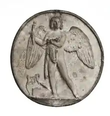 The reverse shows The Genius of Light, engraved after the 1841 plaster relief by Bertel Thorvaldsen.[4]