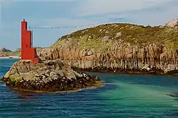 The island is located around 1.5 km East of Arranmore and South-West of the small island of Eighter. A footbridge connects the two islets, both known for pleasant sandbeaches.[3] The inner part of Inishcoo is mainly rocky (granite) and bears a small lake.[4]