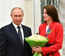 Deriglazova was left extremely frustrated by her Olympic experience and resolved to train harder under the new direction of Stefano Cerioni, former coach of the Italian foil teams.[7] During the 2012–13 season she won her first World Cup title at Budapest, followed by three other victories in Saint-Petersbourg, Tauberbischofsheim and Seoul. Her ambitions for the 2013 European Championships in Zagreb were however cut short in the first round of the individual event by World No.88 Anastasiya Moskovska. In the team event, Russia were defeated by France in the semi-finals, then by Hungary in the match for the bronze medal, and came away with no medal. Deriglazova bounced back by taking the gold medal at the 2013 Summer Universiade after defeating teammate Larisa Korobeynikova in the final.[8] At the World Championships in Budapest Deriglazova made her way to the semi-finals, where she was defeated 15–11 by Arianna Errigo and took the bronze medal. In the team event, Russia were defeated by France in the semi-finals, but prevailed over South Korea to earn the bronze medal.