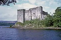 The castle that stands on the wooded island of Innis Chonnell has thick outer walls.[2] It was the original stronghold of the Clan Campbell from possibly the eleventh century or earlier.[2] It was the seat of Cailean Mór (Sir Colin Campbell) who was killed fighting the Clan MacDougall at the Battle of Red Ford in 1296.[2] Later John MacDougall held the castle against Robert the Bruce in 1308.[2] Sir Colin Campbell's son, Sir Neil Campbell, married Bruce's sister, Mary, and Sir Neil fought for the Bruce at the Battle of Bannockburn in 1314.[2] Innis Chonnel Castle was abandoned by the Campbells as their residence in the fifteenth century, but it was still used as a prison.[2] The young Domhnall Dubh ("Black Donald"), son of Aonghas Óg (Angus) and heir to the Lordship of the Isles, was imprisoned in the castle after the Battle of Bloody Bay, which took place off the coast of the Isle of Mull in 1484.[2] He escaped but after invading Badenoch in 1503 he was recaptured and imprisoned in Edinburgh Castle for forty years.[2] Innis Chonnell Castle was in ruins by the nineteenth century.[2]