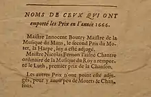 In 1666, Boutry competed at the puy de musique d’Évreux and received the silver harp and the second prize for the motet.[10] In the same year, he was a judge at the puy de musique du Mans, having the two motets received sang and whose best was none other than Louis Bouteiller's one, then a child in the psallete he directed, "de facto" excluded from the competition.[11]