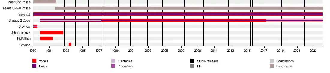 Originally known as JJ Boyz and Inner City Posse, the group introduced supernatural and horror-themed lyrics as a means of distinguishing itself stylistically. The duo founded the independent record label Psychopathic Records with Alex Abbiss as manager, and produced and starred in the feature films Big Money Hustlas and Big Money Rustlas. They formed their own professional wrestling promotion, Juggalo Championship Wrestling, and have collaborated with many hip hop and rock musicians.