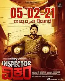 Inspector Vikram is a 2021 Indian Kannada-language action film directed by Narasimha and produced by Vikhyath AR. The film featuring Prajwal Devaraj, Raghu Mukherjee, Bhavana, Avinash, Shobhraj and Dharma, was released on 5 February 2021 to positive reviews for cast performances, action sequences and entertainment value.[2][3][4] The film was an ode to the 1989 comedy thriller of the same name.[5][6]