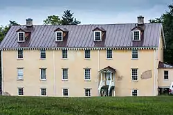 The main house is a 3+1⁄2-story stuccoed stone building. The large plain building is six bays wide with a partly sunken basement. The main entrance is through a small porch offset to the right to the first floor, replacing the original entrance, which was on the opposite side facing a tiered garden. The interior remains largely as it was when the property was a school, with a central hallway on each level running the length of the building. The second floor and attic levels are partitioned into smaller rooms originally used as dormitories. The property also features 13 log cabins built between 1917 and 1971, used by the club during beagle shows and trials for lodging.[3][4]
